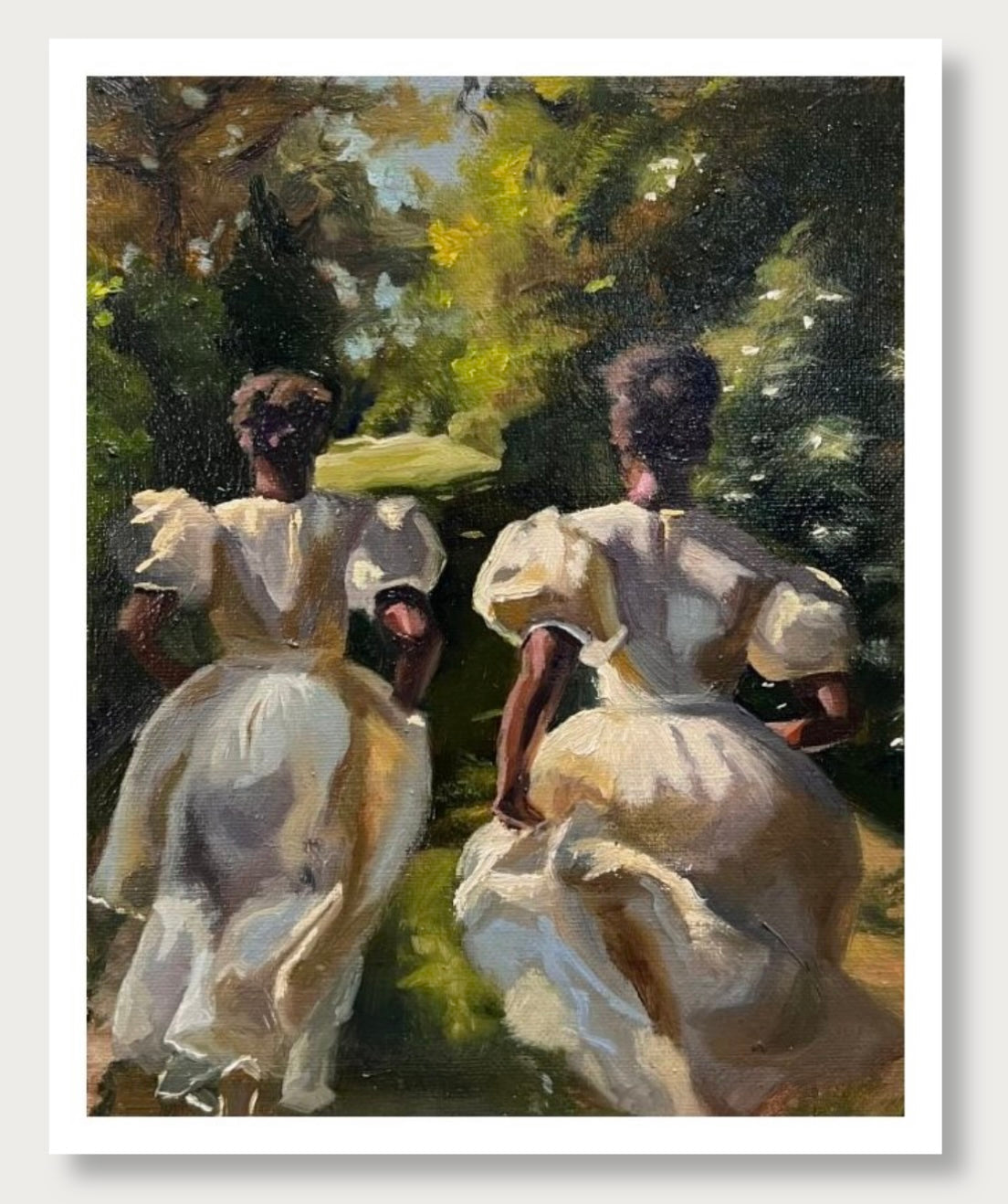Bathed in dappled sunlight, Afternoon Wander captures a tender moment of movement and freedom two figures walking through nature, their dresses glowing softly in the warm light. The brushwork conveys both grace and spontaneity, evoking a timeless sense of connection and calm.
