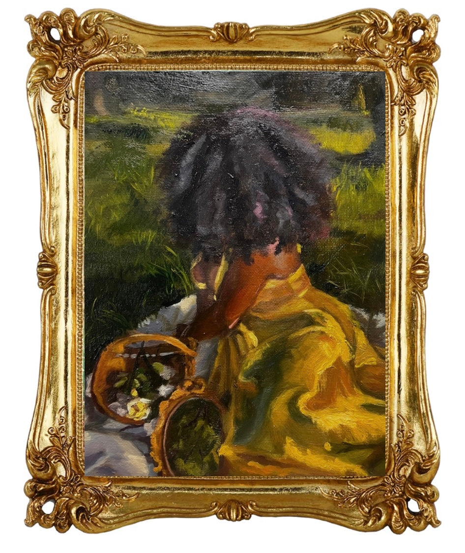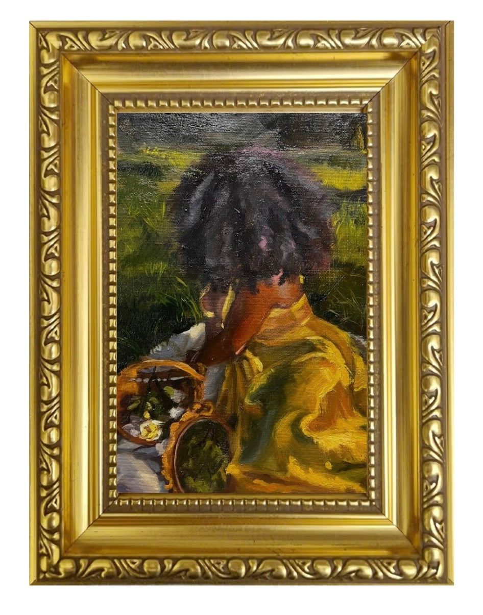 Bathed in the warmth of afternoon light, Golden Hour Reverie captures a quiet, contemplative moment seated among the grass, wrapped in golden tones and natural serenity. Each brushstroke celebrates softness, solitude, and the radiance of nature.