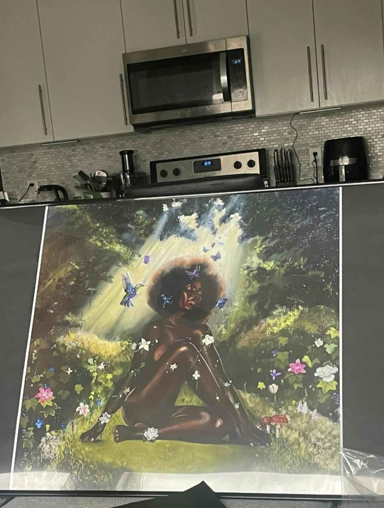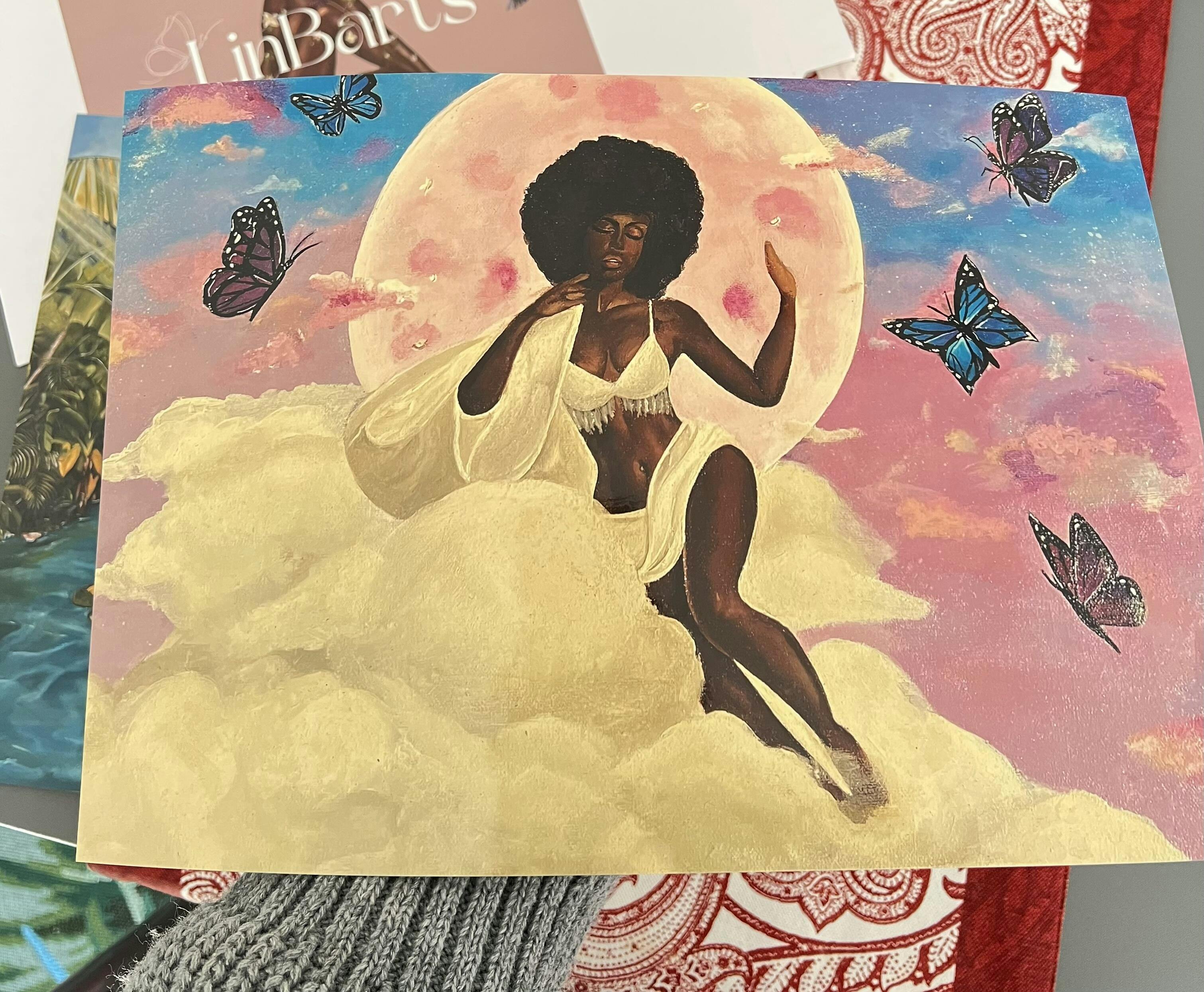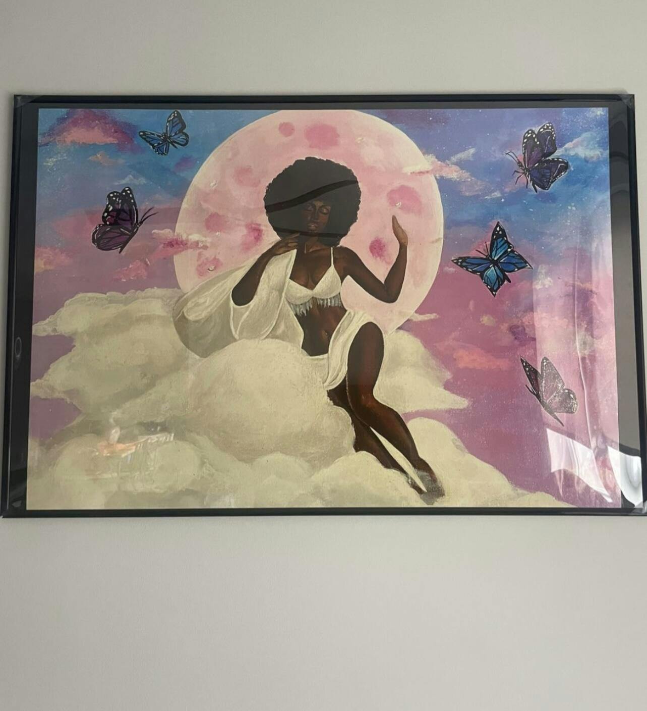 To honor black women in their melanin forms, I sought to create an aesthetically pleasing painting with purple/pink clouds and a moon. I captured a black goddess floating amongst the butterflies, to add a sense of energy and vivacity to the piece. An ode to the beauty of black women, Melanin Sleeps celebrates the magic and majesty of melanin forms.