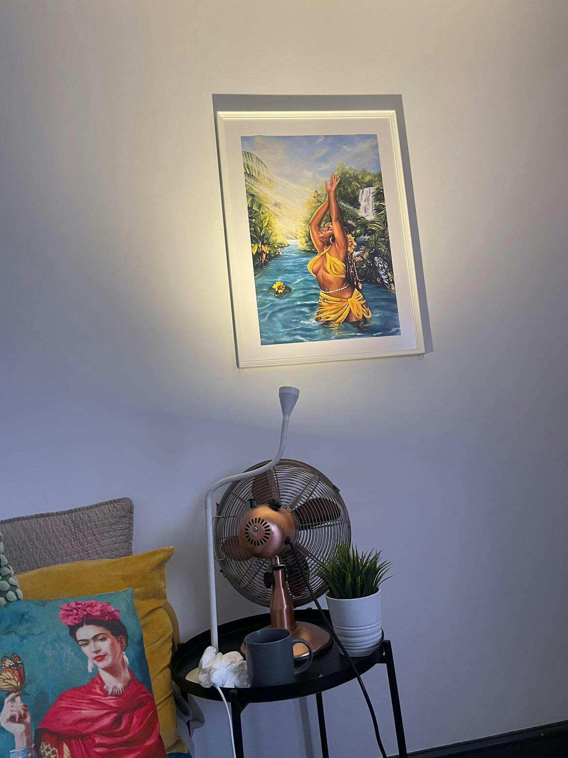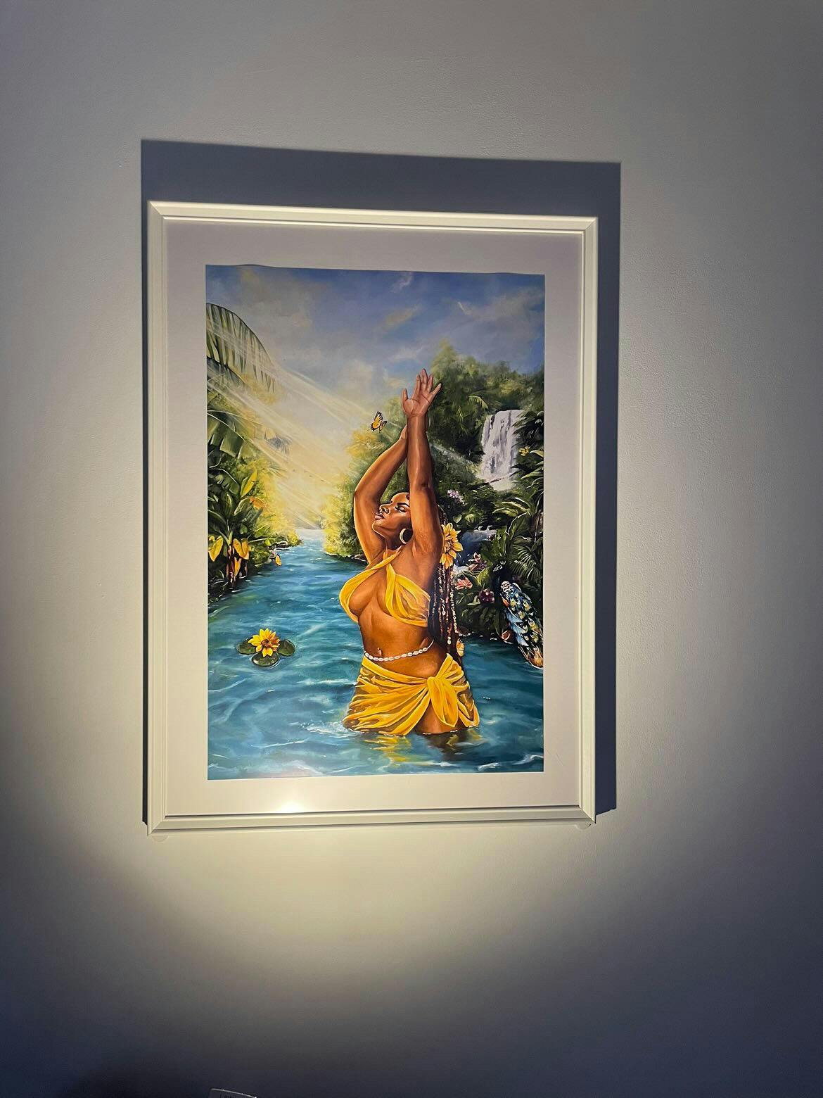 The backdrop of blue and yellow provides an inviting atmosphere, enabling Oshun to spread her energy throughout her environment. She is portrayed in an uplifting pose, with the sun's rays glimmering off her skin and giving her a luminous golden luster.