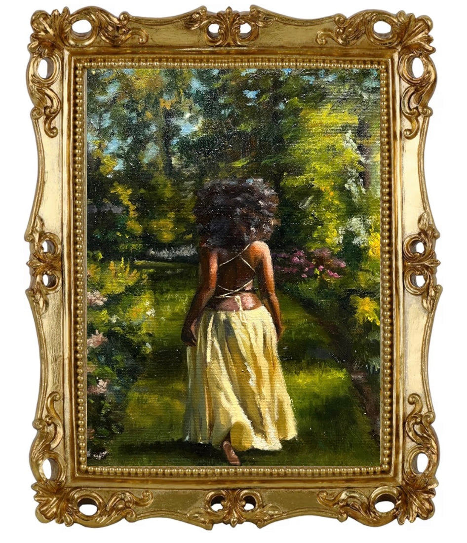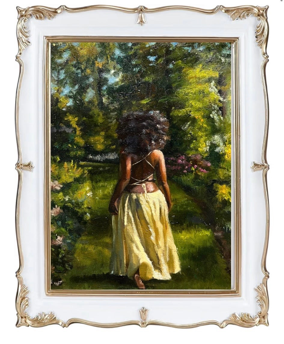 Quiet Serenity captures a tranquil moment of reflection and calm as the figure walks through a lush garden, bathed in gentle, dappled light. The painting evokes a sense of peace, inviting the you to immerse yourself in the quiet beauty of nature and the soothing rhythm of the surroundings.
