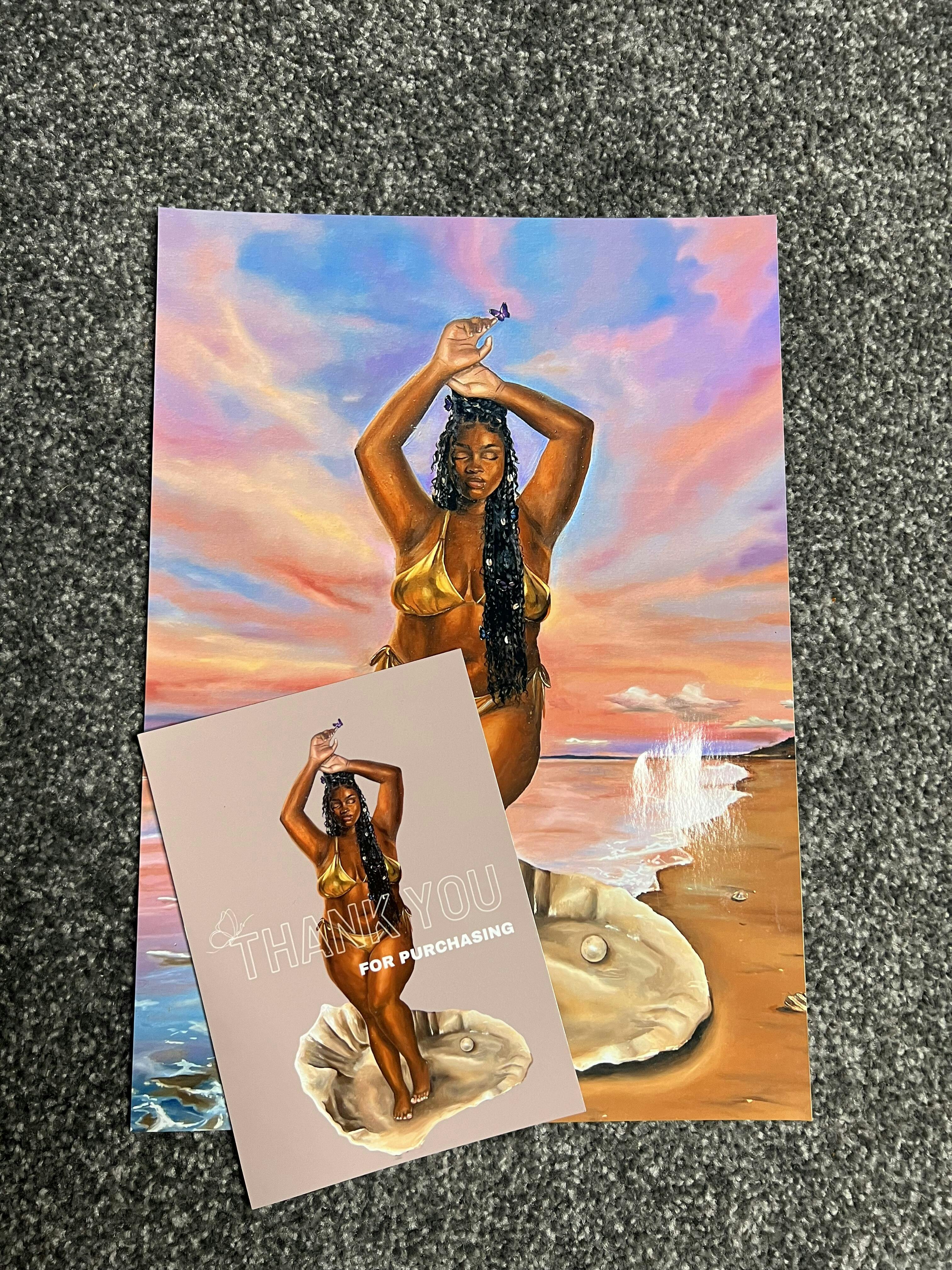 I found this artist on tiktok and this is the best purchase I made! I bought a Venus print and a keychain set to go together! As it was my first time buying a print, I went small but I will be back for more prints in a bigger size! The print is accurate to the description on the website. I was drawn to this piece as a plus sized woman myself. This artist really knows how to capture skin tones so well. My Thankyou card had my name inside and matched my print!