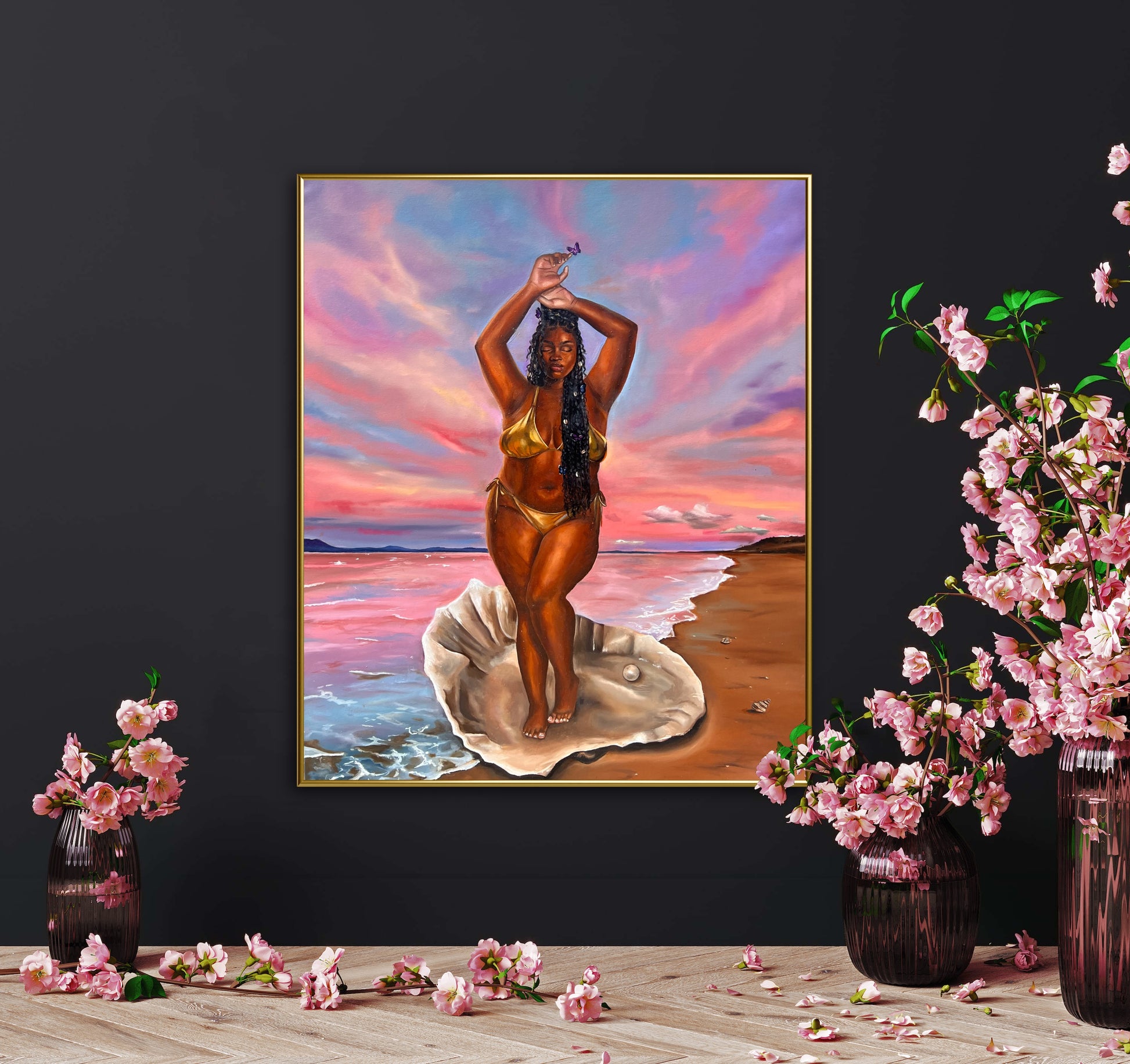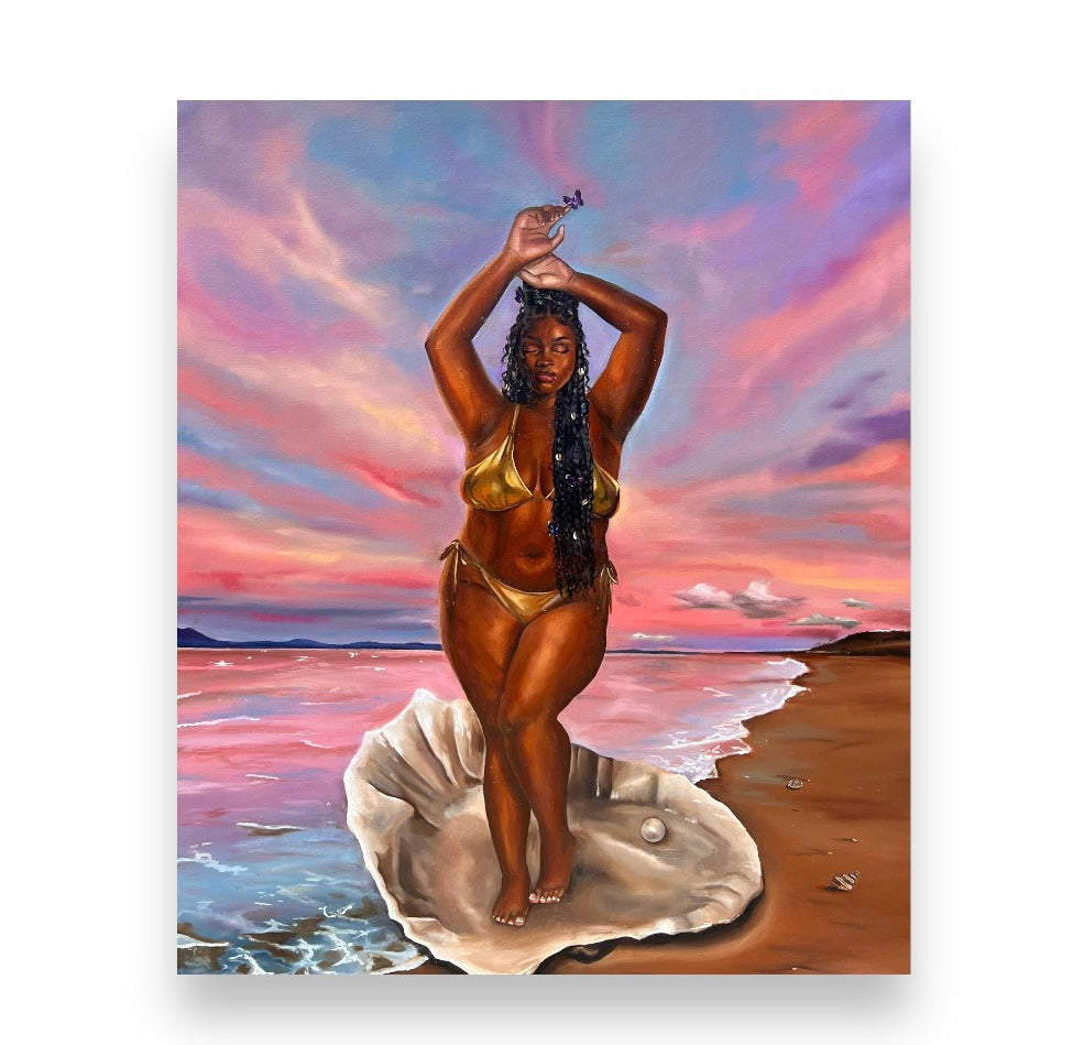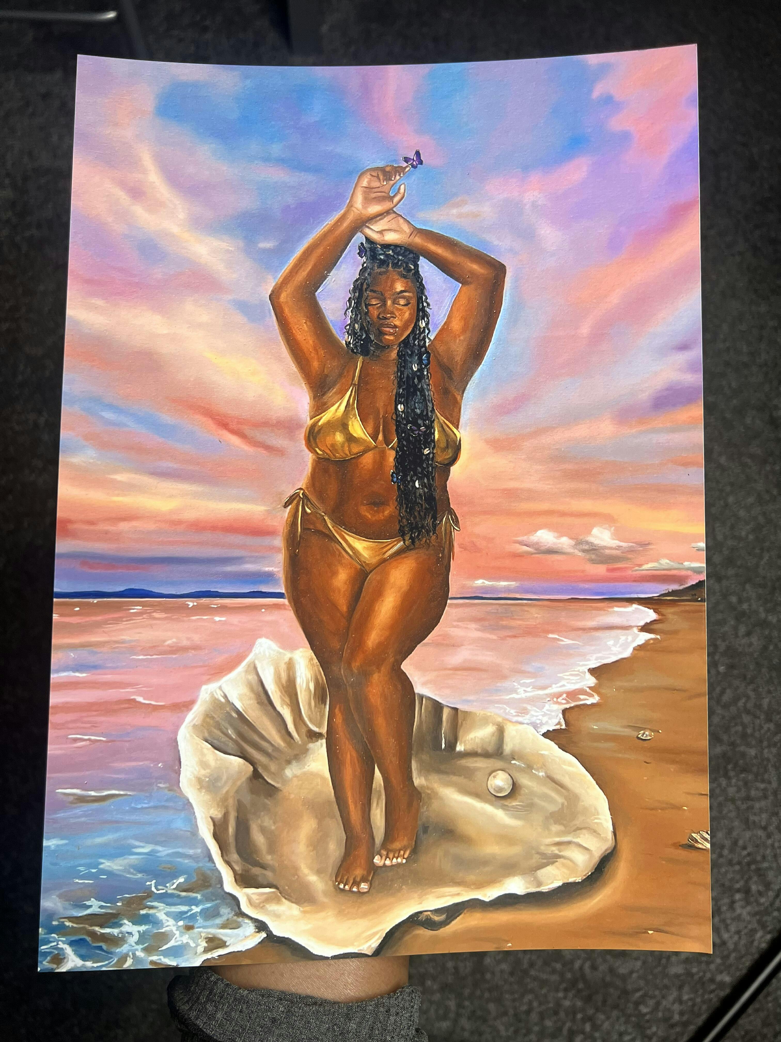 Taken from the classical work of Sandro Botticelli's Birth of Venus’ I depicted a modern-day version of Venus in my own artistic style. In my painting, Venus is pictured on a shell with a soft pastel sky behind her, yet the main focus of this painting is the type of woman represented.